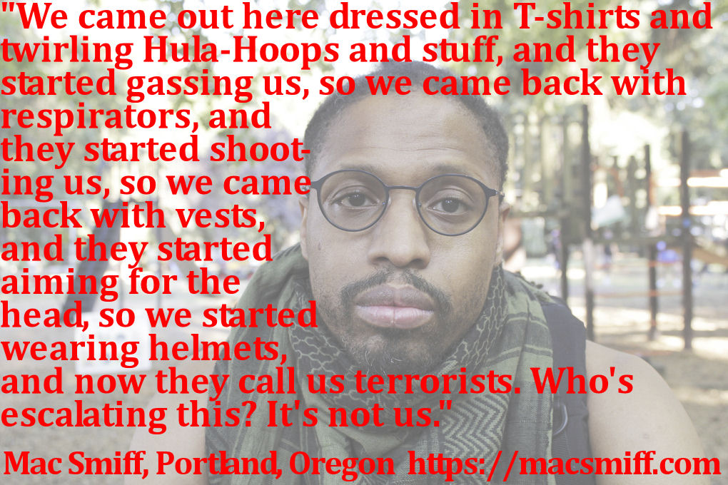 But, every single thing the national media reported, and local elected officials berated, the Feds for doing, the local cops had been doing for weeks before the Feds got here and are still doing nightly, now. Haven't heard a peep out of the elected officials (including the mayor, to whom the cops report, who made a big deal about showing up when the Feds were here and hasn't been seen since). National media (and many of the white protesters) went home.