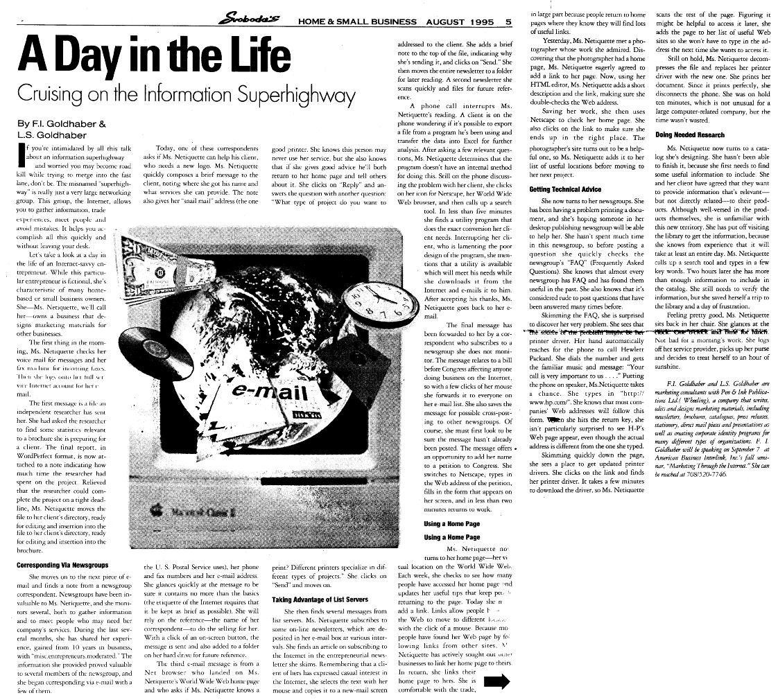 At the time, my sister, L.S. Goldhaber, and I had been in business for more than a decade writing, editing, and designing marketing materials such as newsletters, brochures, catalogues, press releases, stationery, direct mail pieces, resumes, and presentations for individuals, non-profits, and businesses as well as creating corporate identity programs and helping clients adjust to life "Cruising on the Information Superhighway". We had two offices, one in Seattle, Washington where she lived; the other in the Chicago, Illinois suburbs where I did with five employees besides ourselves.