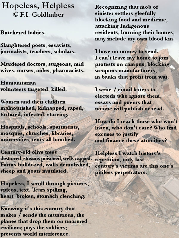 "Hopeless, Helpless" was included in the second issue of Waffle Fried Literary Magazine, "Resilience". The broadside is built on a photo, available on Unsplash, of rubble in Gaza, taken by Emad El Byed in November 2025.