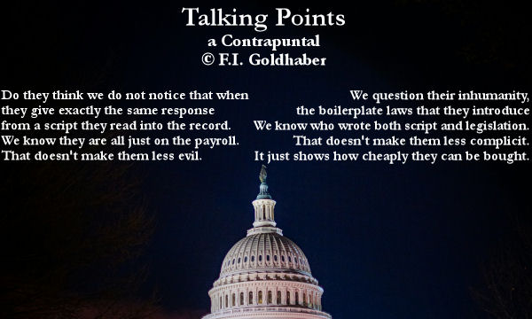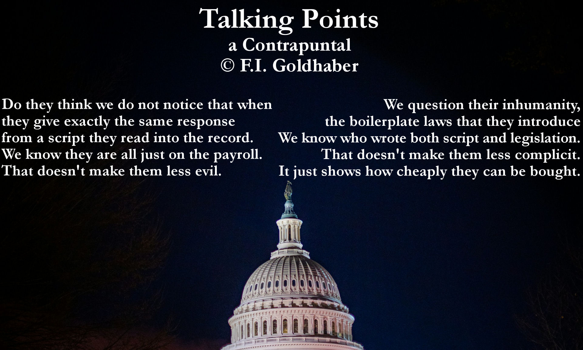 "Talking Points", included in the second issue of Waffle Fried Literary Magazine, "Resilience", was the second Contrapuntal poem I wrote (although it was the third published). The broadside is built on a photo, available on Unsplash of the U.S. capitol taken by Nils Huenerfuerst in 2024.